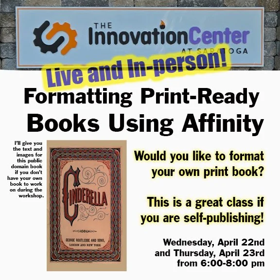 Are you interested in learning how to format your own print book? Do you prefer in-person, live classes? If so, this class is for you! Formatting Print-Ready Books Using Affinity will be held at The Innovation Center at Saratoga on Wednesday, April 22nd, and Thursday, April 23rd, from 6-8 pm. You'll learn how to format books using Affinity Publisher and the new Canva Affinity Suite as well. If you don't have your own book to work on, I'll give you the text and images for the public domain book, Cinderella, to work format during the workshop. Click here for more information and to sign up: https://innovationcentersaratoga.org/classes/#!event/2026/1/28/formatting-print-ready-books-using-affinity-publisher